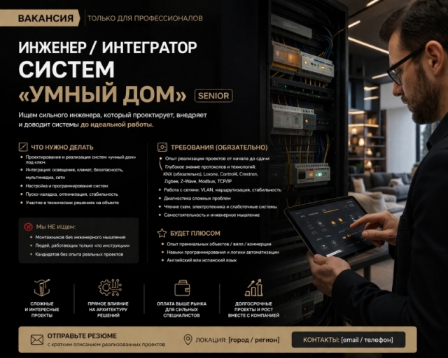 Ищем не монтажника, а сильного инженера с реальным опытом внедрения сложных систем «умного дома». Нужен человек, который понимает архитектуру, берет ответственность за результат и доводит систему до идеальной работы.